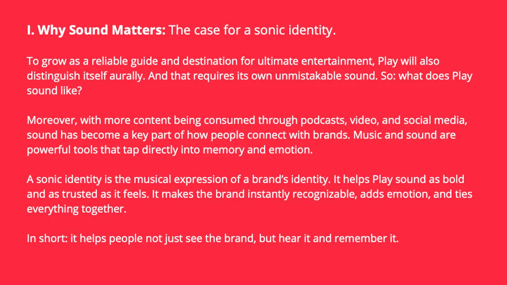 The score is the backbone of a sound identity. It contains all the elements and layers for further derivatives to make a brand sing in a relevant, memorable and ownable way.